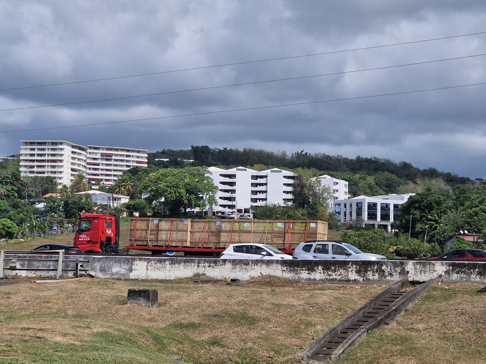 Itinéraire bis très fréquenté parallèle et visible depuis l'autoroute, au coeur d'une zone mixte d'habitation dense, d'espaces commerciaux et sportifs..